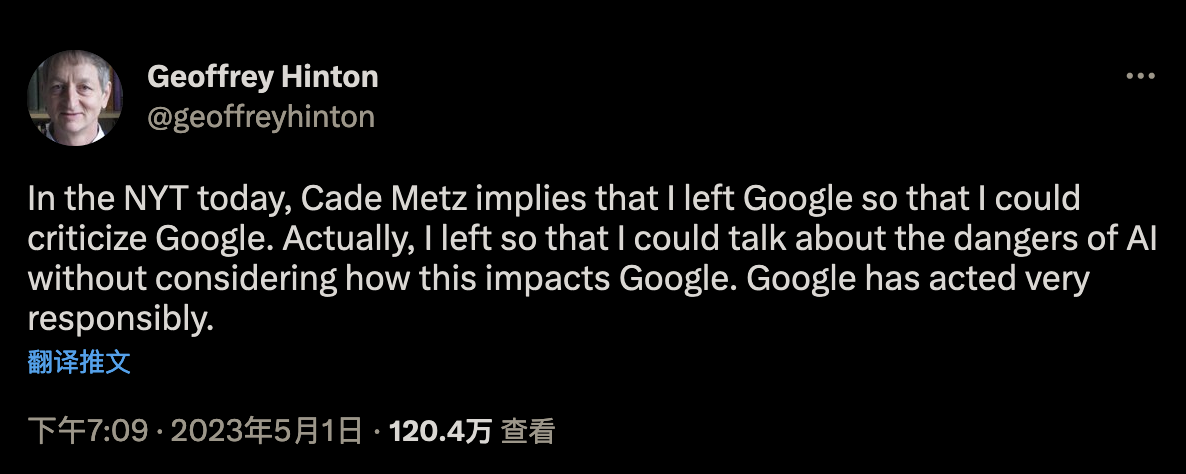 为了防止此次离职被大众所误解,他澄清此次离开 Google 并不是为了批评该公司,而是为了公开谈论 AI 的危险,且不必担心他的言论会对 Google 产生影响。他同时也表示,到目前为止,Google 在人工智能方面 "表现得非常负责任"。