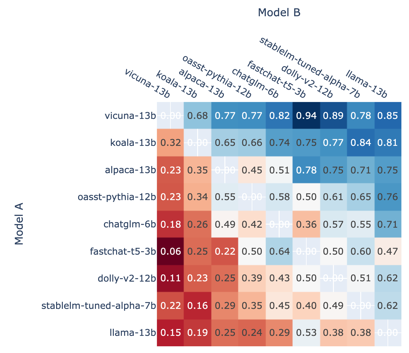 结果表明,130 亿参数的 Vicuna 以 1169 分夺得榜首。其次分别是同样 130 亿参数的 Koala、以及 LAION 的 Open Assistant;清华大学开源的中英双语对话模型 ChatGLM-6B 以 985 的 Elo 得分排名第 5。而 Meta 的 LLaMa 则排在了倒数第二,Stability AI 的 StableLM 以 858 分排名倒数第一。