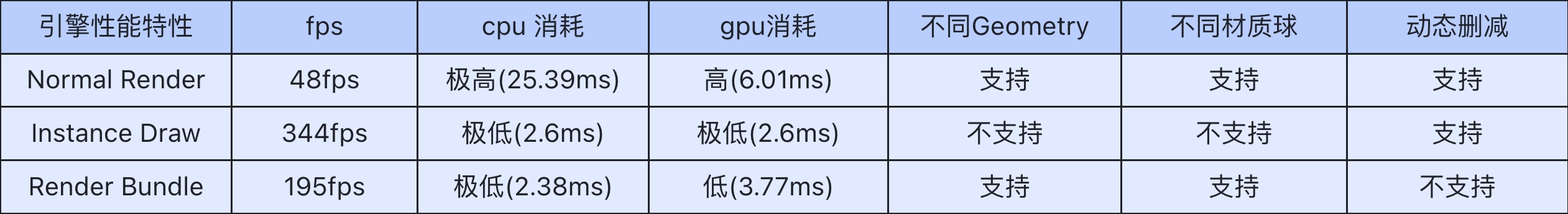 除了上文中提到的使用GPU缓存(GPUBuffer)提高基础性能之外,引擎还针对不同的用户使用场景进行了三个性能优化方案的对比。以下就以绘制55000个box为场景对比不同渲染方案的性能消耗: