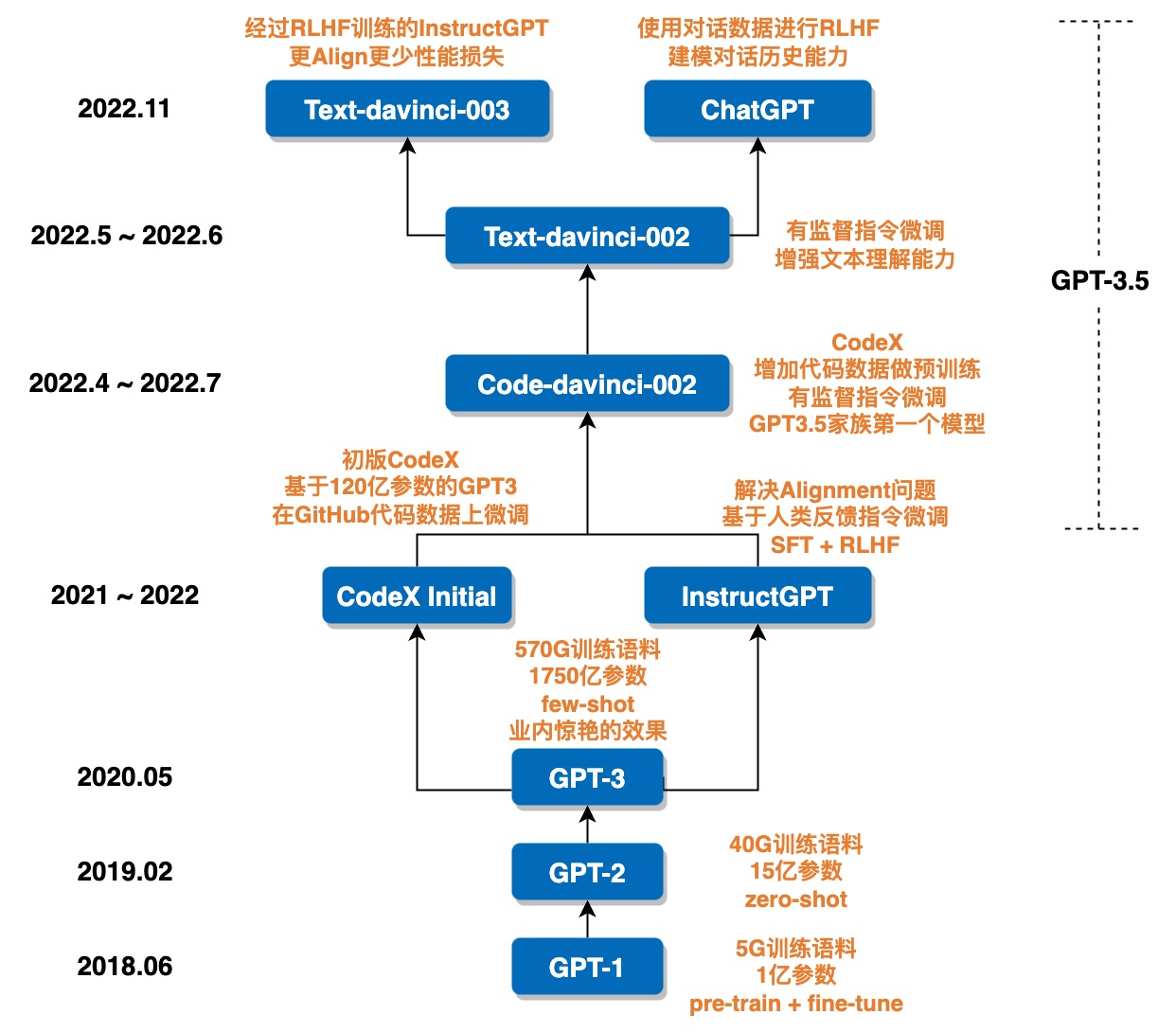 2022年11月,在text-davinci-002的基础上,通过RLHF获得了两个不同的模型变体,即text-davinci-003和ChatGPT。前者恢复了一些text-davinci-002所牺牲的上下文学习能力,同时提高了zero-shot能力。而ChatGPT则通过牺牲上下文学习能力来换取建模对话历史的能力。