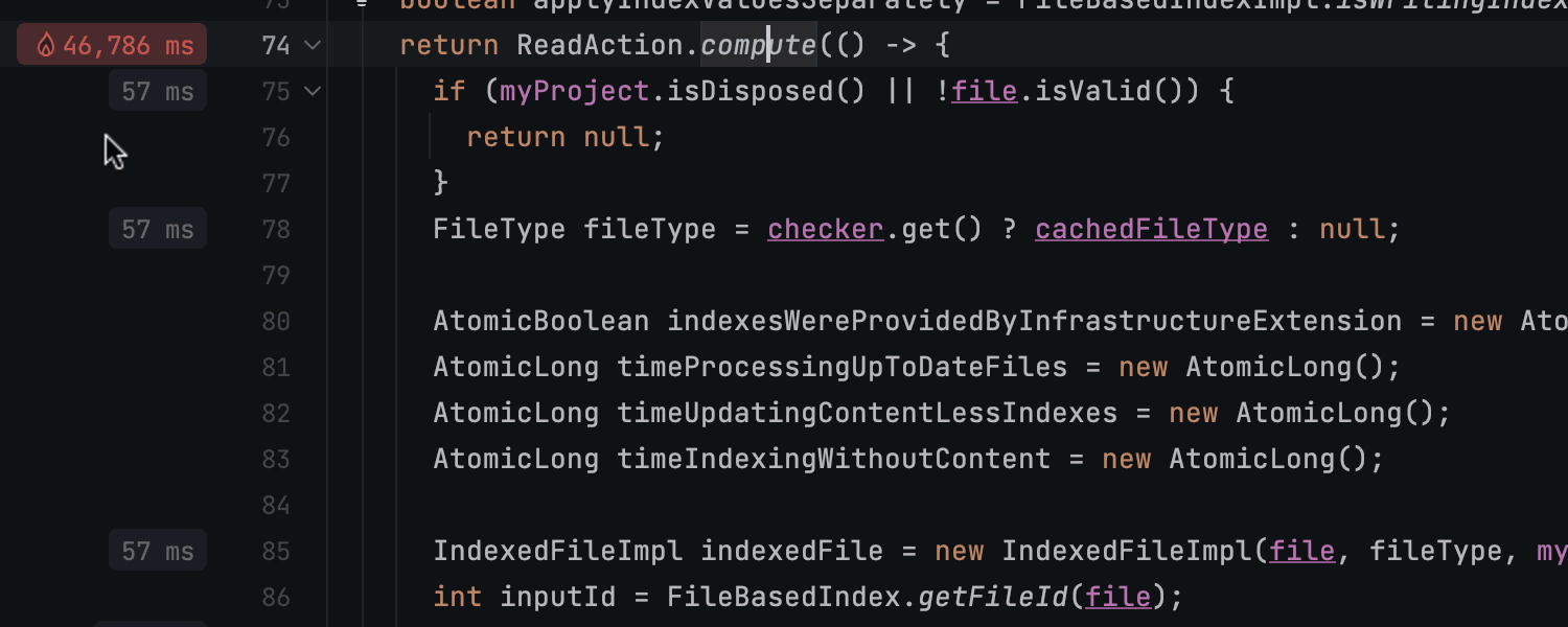 通过此添加,来自 IntelliJ Profiler 的数据直接在编辑器中可视化 —— 执行时间和内存分配数据显示在相应代码行旁边的 gutter 中。这些注释采用 color-coded,可帮助你立即了解哪些方法最需要注意的。占用 parent method 大部分时间的调用以红色突出显示,如果总执行时间受到显着影响,它们将另外显示一个 fire 图标。