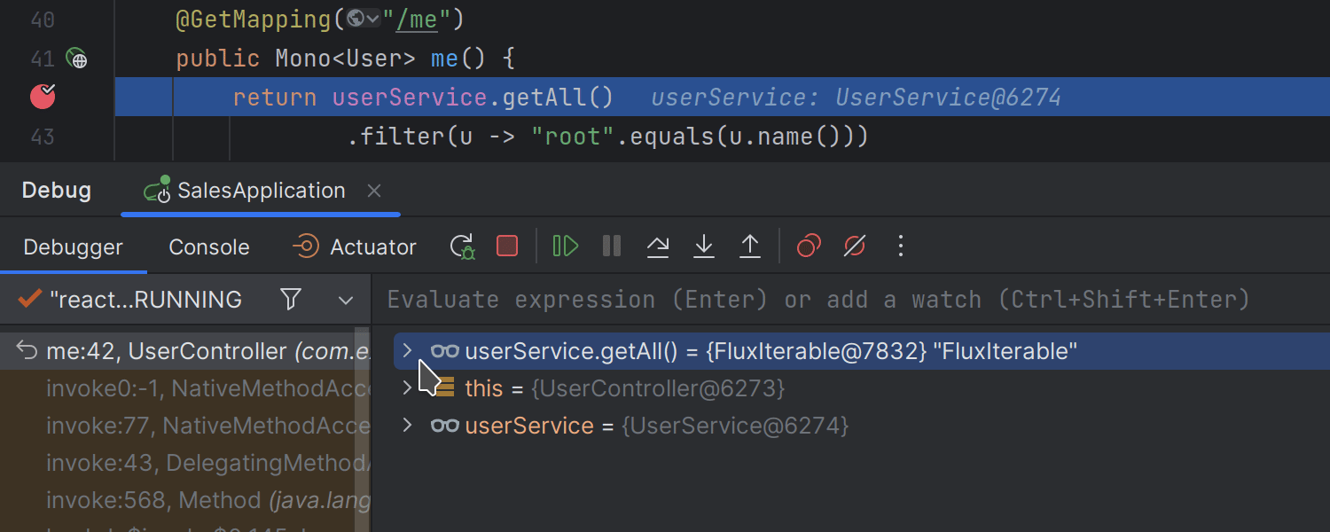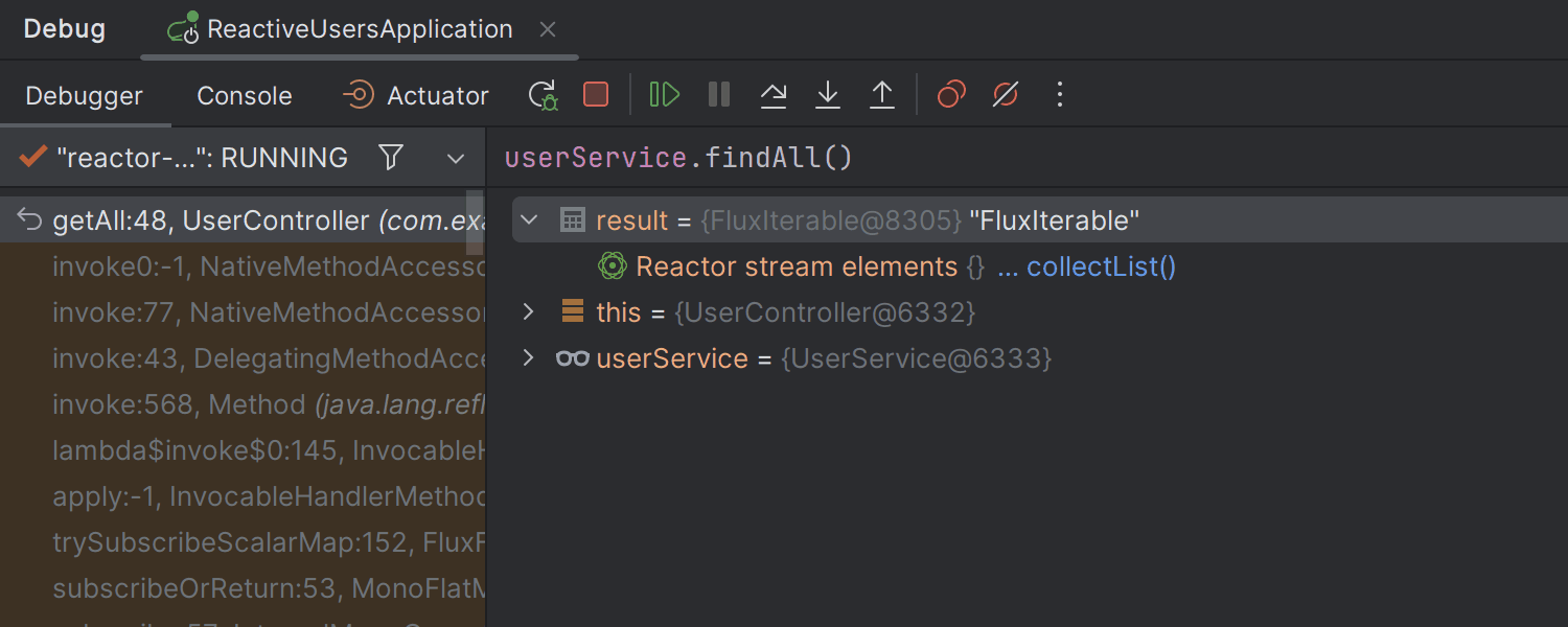 在调试反应式应用程序时,你现在可以轻松评估 Mono 和 Flux 类型的 watches 和局部变量的值。 IDE 现在会在调试会话期间检测到它们,并在变量视图中提供相应的 get 或 collectList 链接,你可以单击该链接以立即计算反应流项目。