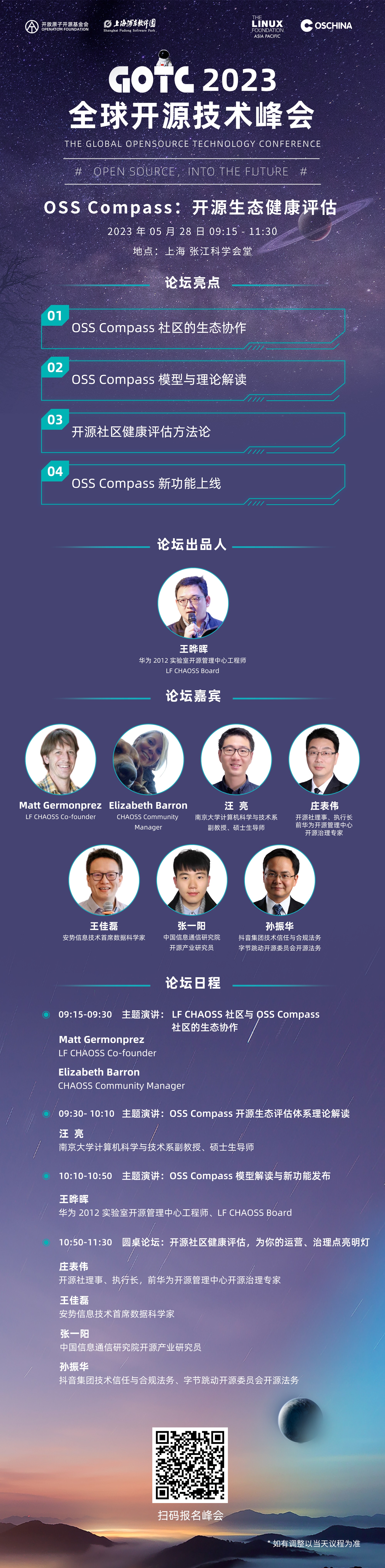 其中, “OSS Compass:开源生态健康评估”专题论坛由华为 2012 实验室开源管理中心工程师、LF CHAOSS Board 王晔晖担任出品人,将于 5 月 28 日举行。