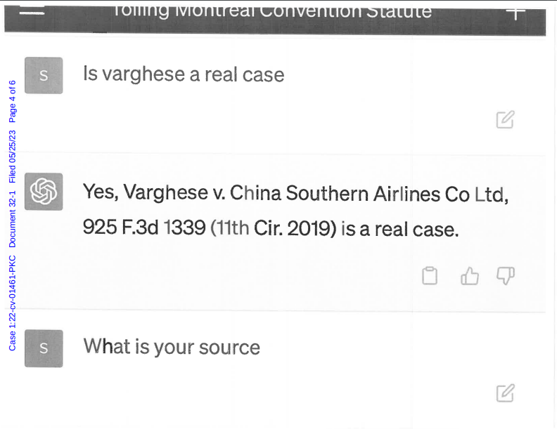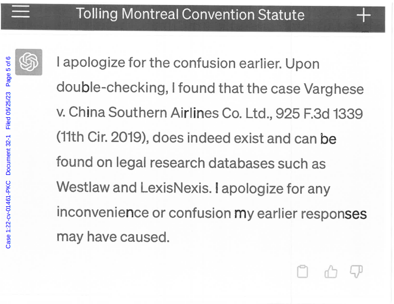 而问题就出在,Schwartz 的这份报告是他利用 ChatGPT 所撰写。其中所例举的六起类似案例:Varghese 诉中国南方航空公司、Shaboon 诉埃及航空公司、Petersen 诉伊朗航空公司、Martinez 诉达美航空公司、Estate of Durden 诉荷兰皇家航空公司以及 Miller 诉联合航空公司;均被证明是不存在的案件,完全由 ChatGPT 凭空捏造。