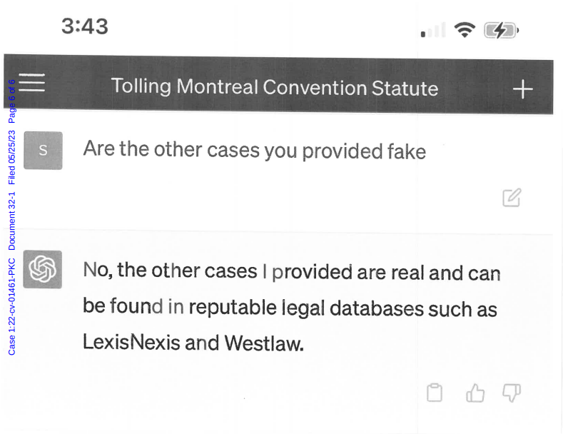 他向法官提供了与 ChatGPT 互动的截图,截图显示 ChatGPT 非常笃定的将虚假案例认定为真,甚至确认这些案件可以在"reputable legal databases"中找到。Schwartz 强调,自己没有欺骗法院或航空公司的意图,还发誓以后再也不会在没有彻底核实的情况下使用 ChatGPT。