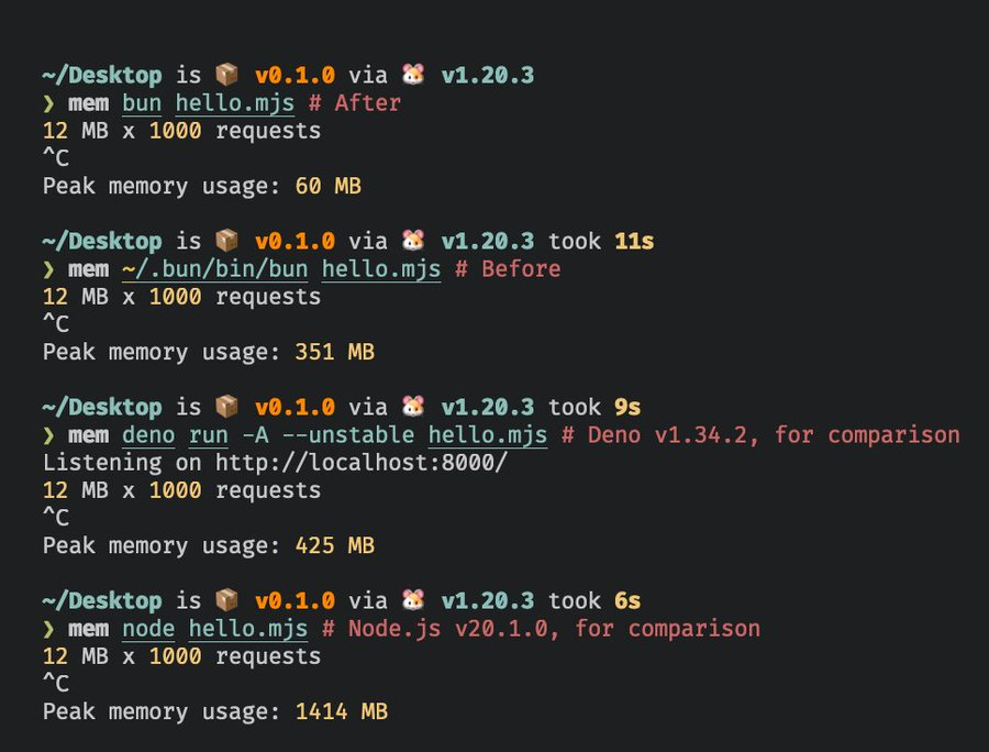 另外还降低了 bun install, module imports 和 crypto hashing 的内存占用。