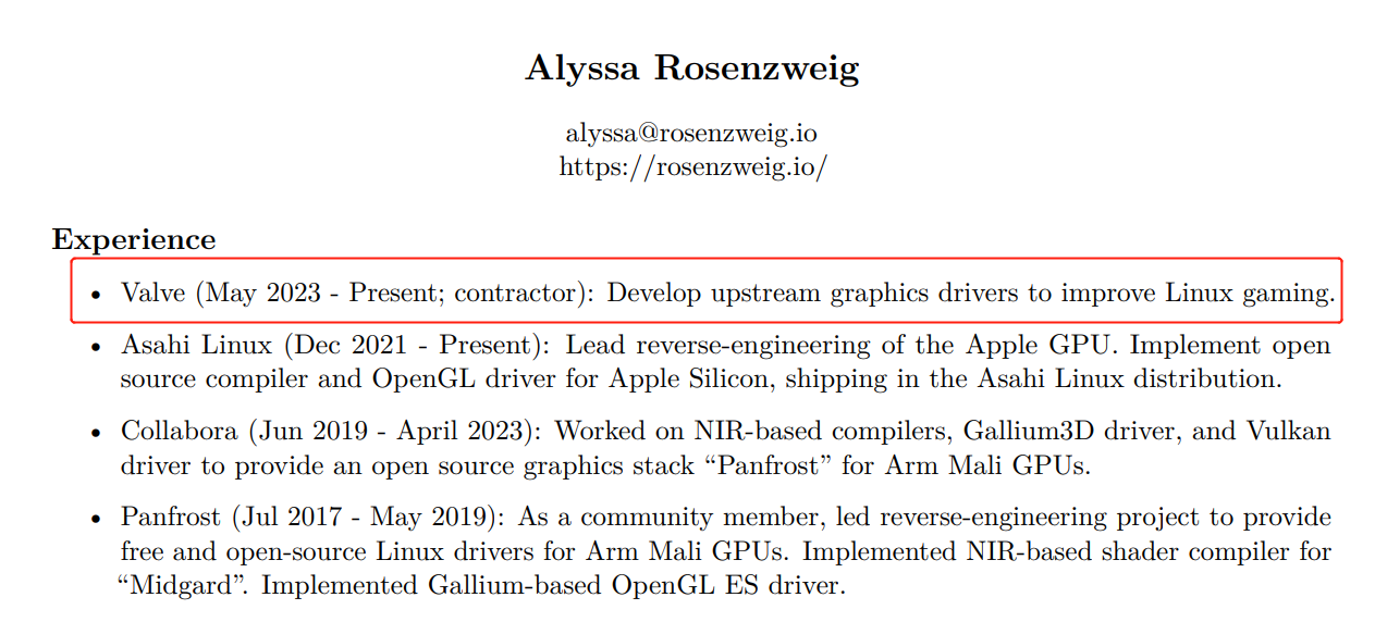 但在 4 月份,Alyssa Rosenzweig 宣布辞去 Panfrost 驱动程序维护人员的职务,同时也离开了 Collabora。近日,一位目光敏锐的网友发现,Alyssa 更新了简历,最新简历显示她现在受聘于 Valve,负责上游图形驱动程序的开发,其重点显然是改进 Linux 游戏。