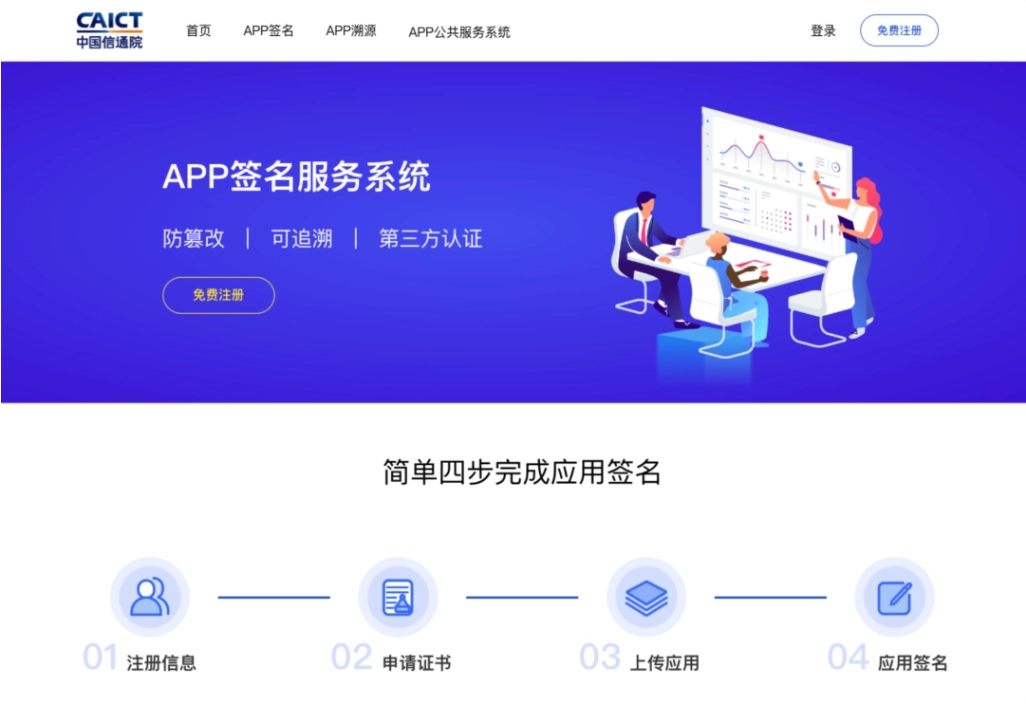 2022年,在工业和信息化部信息通信管理局的指导下,中国信通院组织APP开发运营者、应用分发平台、专业检测机构、终端厂商和电子认证服务机构共同合作,联合建立了APP签名服务系统。