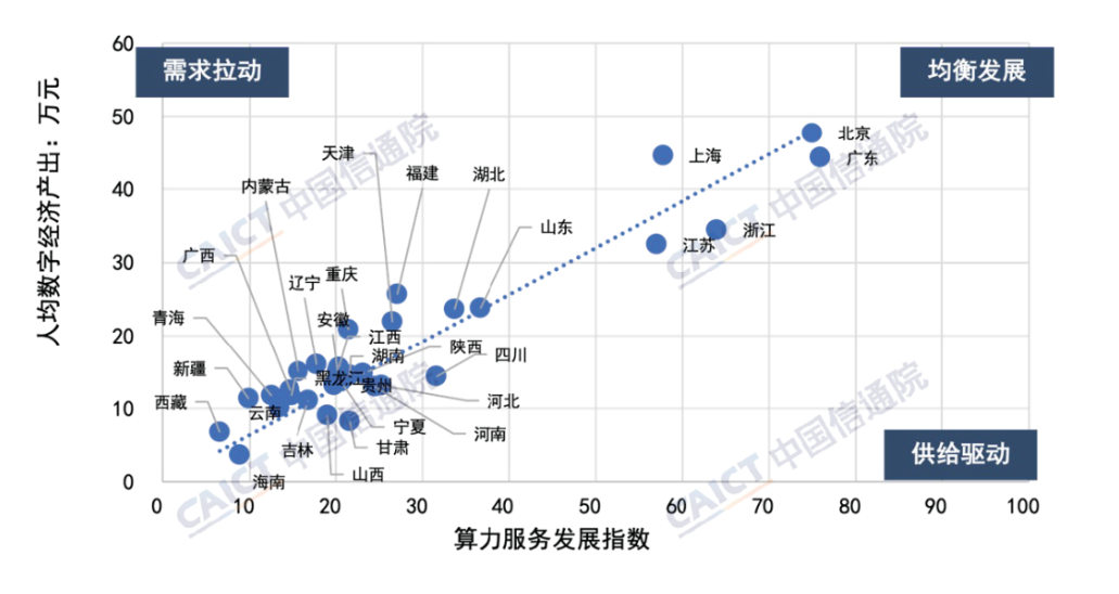 3. 我国各省份算力服务发展指数与其数字经济规模呈显著正相关关系。据测算,单位算力服务发展指数提升可以带来0.64万元的人均数字经济产出增长,以及566.4亿元数字经济规模的增长。其中珠三角、京津冀及长三角等地的经济牵引效用尤其明显。北上广浙苏五个省市的算力服务发展指数均超过50,且人均数字经济产出超过35万元,五个省市的算力服务总收入占全国67%以上。