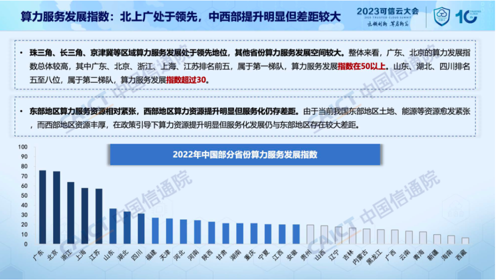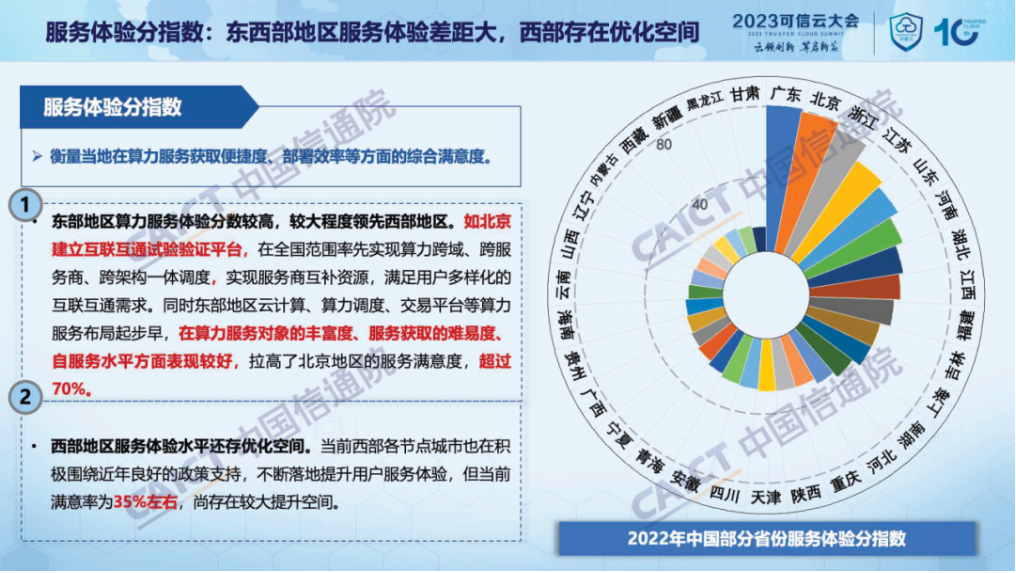 2. 北上广算力服务指数处于领先位置,中西部提升明显但差距较大。为客观全面的衡量我国各省份算力服务化程度及产业赋能水平,报告提出算力服务发展指数体系,从资源服务化程度、应用赋能水平以及服务体验水平3个维度展开研究。综合来看,我国珠三角、长三角、京津冀等区域算力服务发展处于领先地位。与东部相比,西部地区土地、能源等资源丰富,发展潜力大,如四川借助区位优势已提升至第8位,但西部整体算力服务水平仍有待提升。