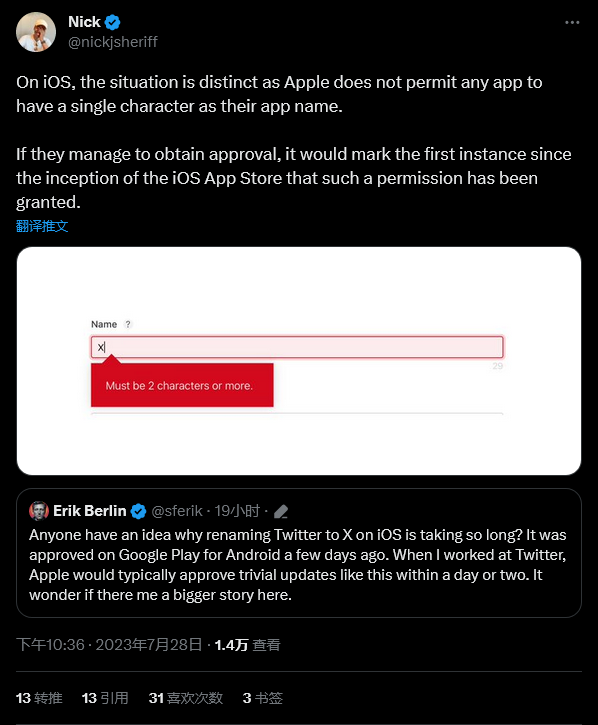 产品设计师 Nick Sheriff 此前在 Twitter 上表示,在 iOS 上苹果不允许任何应用使用单个字符作为命名。但目前看来,「X」打破了这条规则。
