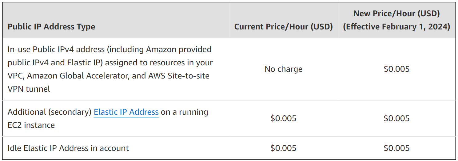 从 2024 年 2 月 1 日开始,对于所有 IPv4 公网地址,AWS 将对每个地址每小时收 $0.005(每个 IP 每小时 0.005 美元),无论是否绑定到服务。新政策适用于包括 AWS EC2、Relational Database Service (RDS) 和 Elastic Kubernetes Service (EKS) 在内的服务。