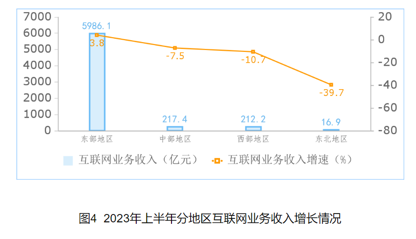 东部地区互联网业务收入保持小幅增长。上半年,东部地区完成互联网业务收入5986亿元,同比增长3.8%,增速较一季度提高0.9个百分点,高于全国增速1.2个百分点,占全国互联网业务收入的比重为93.1%。中部地区完成互联网业务收入217.4亿元,同比下降7.5%。西部地区完成互联网业务收入212.2亿元,同比下降10.7%。东北地区完成互联网业务收入16.9亿元,同比下降39.7%。