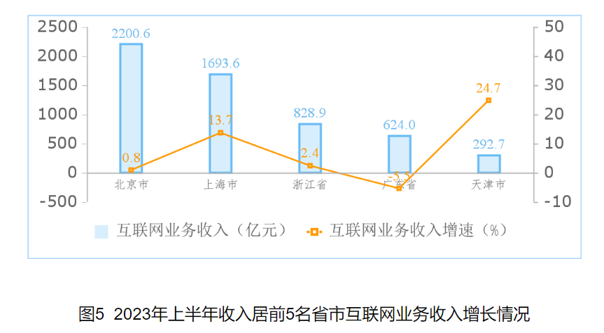 近半数地区互联网业务增速实现正增长。上半年,互联网业务累计收入居前5名的北京(增长0.8%)、上海(增长13.7%)、浙江(增长2.4%)、广东(下降5.5%)和天津(增长24.7%)共完成业务收入5640亿元,同比增长4.9%,占全国(扣除跨地区企业)比重达87.7%。全国互联网业务增速实现正增长的省(区、市)有14个。