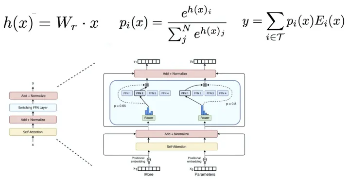 基于当前比较成熟的分布式MoE专家路由选择技术,采用Switch Transformer[2]中的top-1路由机制。每个Expert根据如下的softmax函数被赋予一个概率值,取概率最高(top-1)的那个Expert当作网络的FFN层。其中W_r是做路由选择时需要学习的参数。