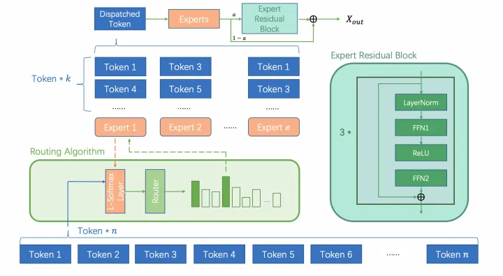 每一个 expert 根据索引计算出对应 tokens 的表示,并将不同 expert 对同一 token 生成的表示加权求和,最后通过 Expert Residual 模块生成最终的输出