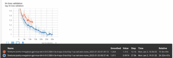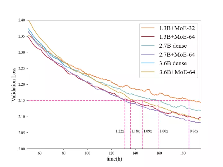 通过以上的图表分析,我们能大致判断出2.7B-Dense模型对应的高能效的稀疏模型是以1.3B的dense模型为底座,同时配置32或者64个专家的MoE模型。下面我们重点分析下1.3B+MoE-32/64和2.7B dense模型的性价比。在单机A100上预训练200个小时后,借助Tensorboard画出预训练验证集loss曲线。我们发现在验证集loss到达2.16时,1.3B+MoE-64模型的收敛速度是2.7B dense的1.17,1.3B+MoE-32的收敛速度落后于2.7B dense模型15%,如下图所示: