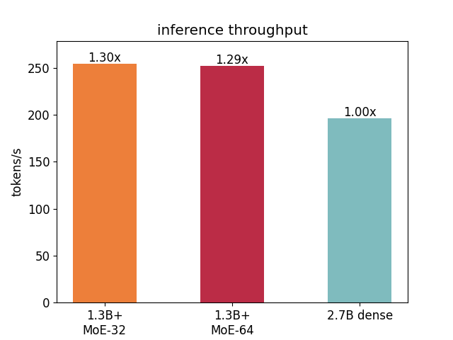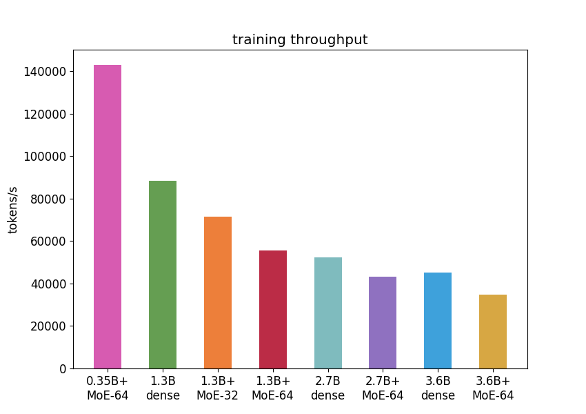 5个模型中,0.35B+MoE-64的训练吞吐速度最快,是其他模型的2倍左右。其余四个模型中,吞吐速度较高的是1.3B dense和1.3B+MoE-32,1.3B+MoE-64和2.7B dense的速度相近。如下图所示: