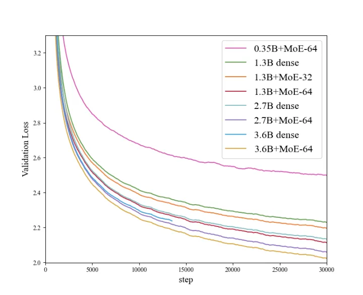 如下图所示,1.3B+MoE32/64模型在相同的step下对比1.3B dense表现出更低的验证集loss,其中1.3B+MoE-64模型的loss甚至低于2.7B dense模型