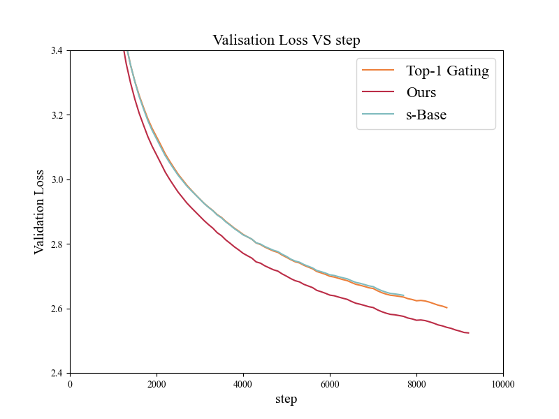 下图是采用自研算法与 Top-1 Gating、s-BASE 算法的验证集 loss 随训练 step 变化的曲线图,我们可以发现,采用自研算法的验证集 loss 始终低于 top-1 gating 和 s-BASE 算法的验证集 loss,证明了我们自研算法的有效性。
