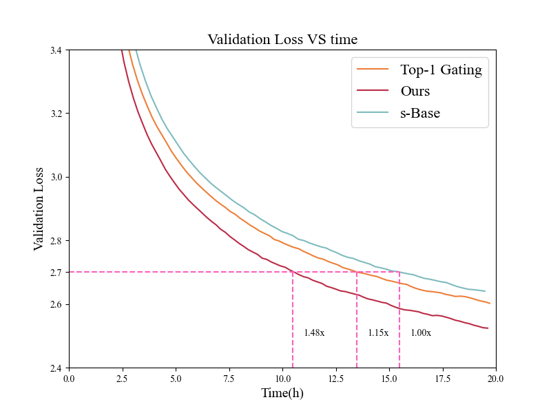 同时,我们观察到,验证集 loss 首次低于 2.7 的时间,自研算法的速度是 s-BASE 的 1.48 倍,极大的减少了模型训练的开销。