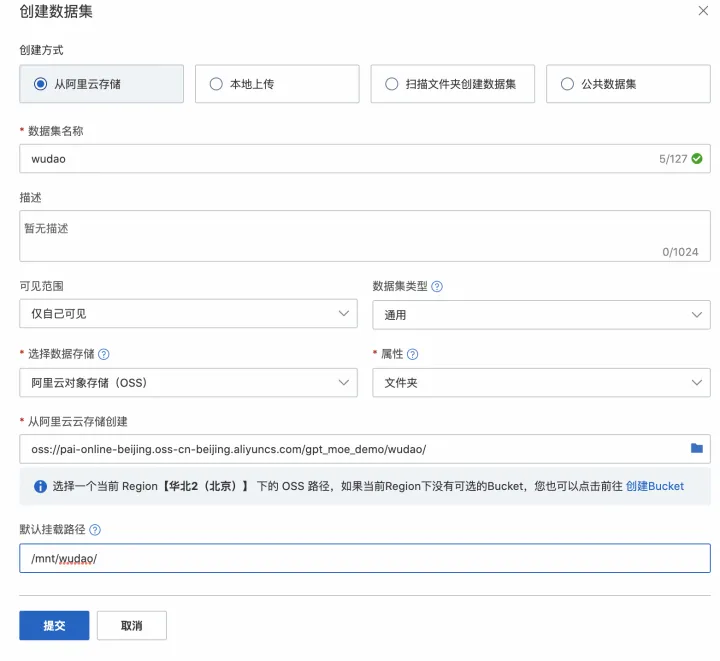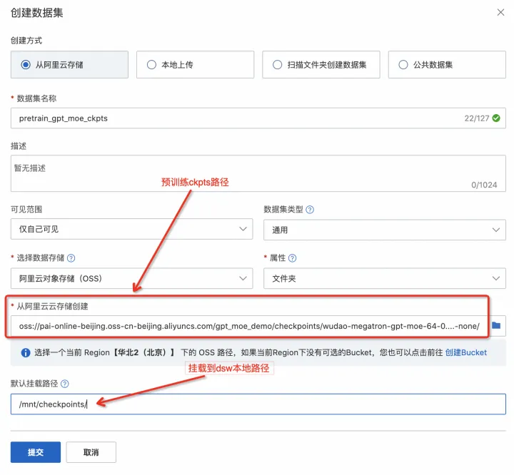 由于预训练数据集体积比较大,采用下载的方式不是很方便。借助于DLC提供的OSS路径的挂载功能,可以很方便的直接使用存储在OSS上的大规模预训练数据集。