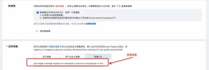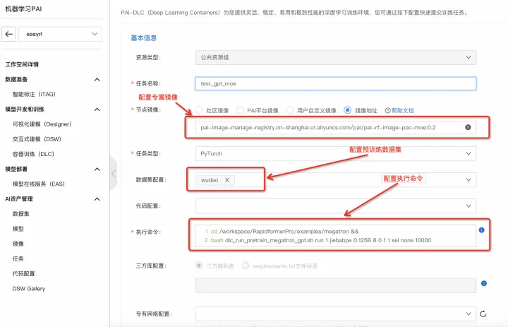 有三个关键的地方需要配置,分别是专属镜像,数据集以及执行命令。节点镜像地址配置为:http://pai-image-manage-registry.cn-shanghai.cr.aliyuncs.com/pai/pai-rf-image-poc-moe:0.2。执行命令配置为: