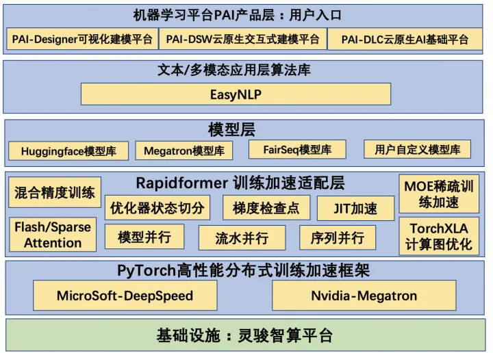 Rapidformer为EasyNLP中各种Transformer模型提供训练加速能力,这是通过有机整合微软的DeepSpeed,英伟达的Megatron来做到的,如下图所示: