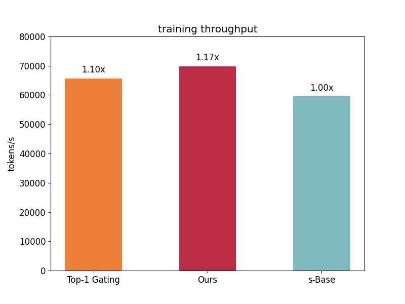 此外,我们也分析了自研算法和 Top-1 Gating、s-BASE 的训练吞吐,如下图所示,采用自研算法相比于 s-BASE 的训练吞吐提升了 1.17 倍。