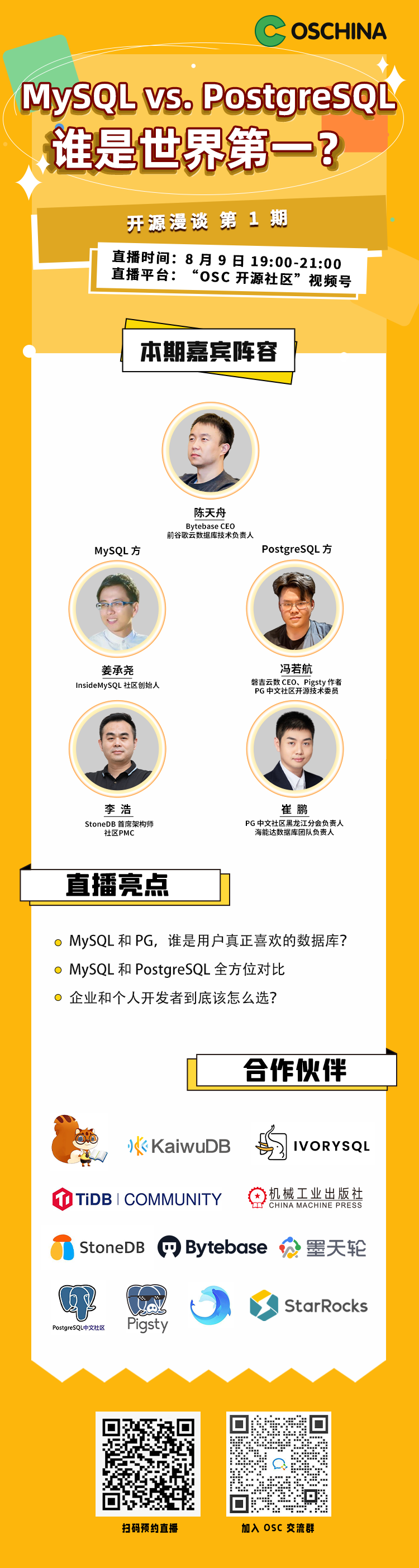 MySQL vs. PostgreSQL,你看好谁呢?快扫码预约直播,一起讨论吧~还可以进我们的 OSC 技术交流群,分享(吐槽)你的使用体验哦~