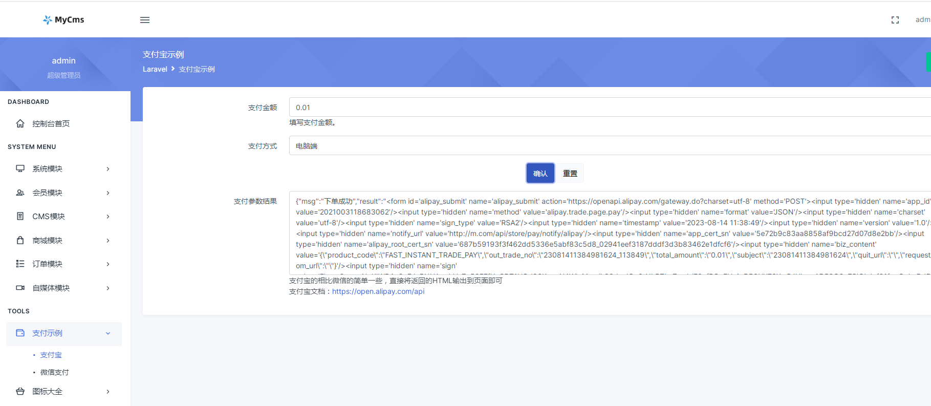 MyCms v4.6 接入支付 & 细化权限管理,开源 Laravel CMS 开发后台