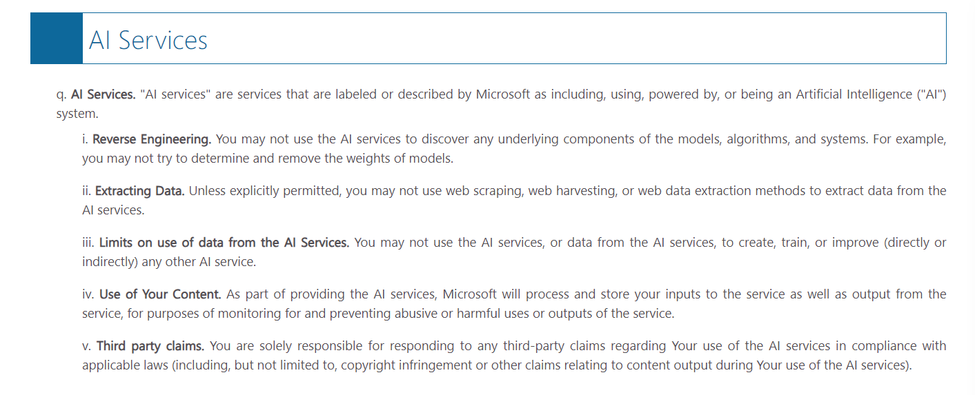 - AI Services 数据的使用限制。 禁止直接或间接使用人工智能服务或从中提取的数据来创建、训练或改进(直接或间接)任何其他人工智能服务。