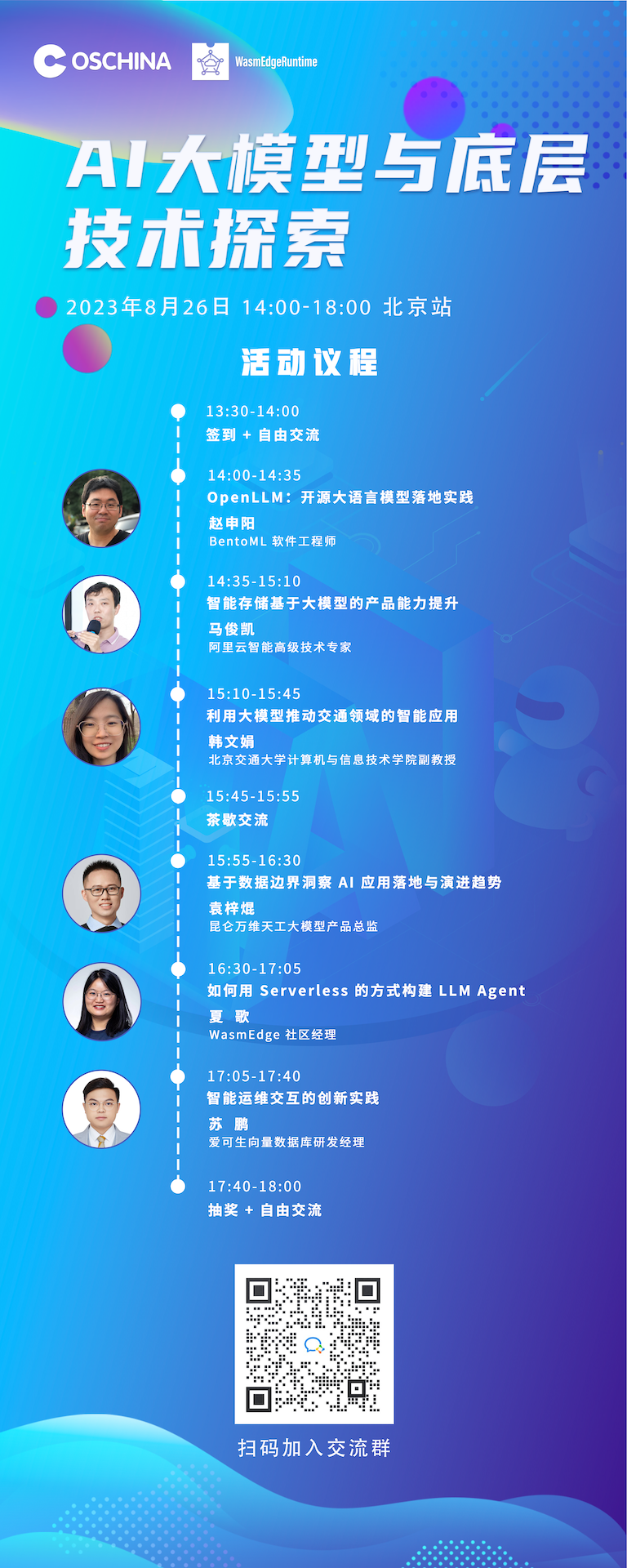 未来,大模型技术研究将会向哪个方向发展,又将如何赋能千行百业?身处其中的我们该如何拥抱新变化?为了找寻答案,开源中国联合 WasmEdgeRuntime 共同举办以“AI 大模型与底层技术探索”为主题的【源创会】线下技术沙龙,邀请来自业界和学界的专家分享他们在 AI 大模型与底层技术方面的研究成果和实践经验。