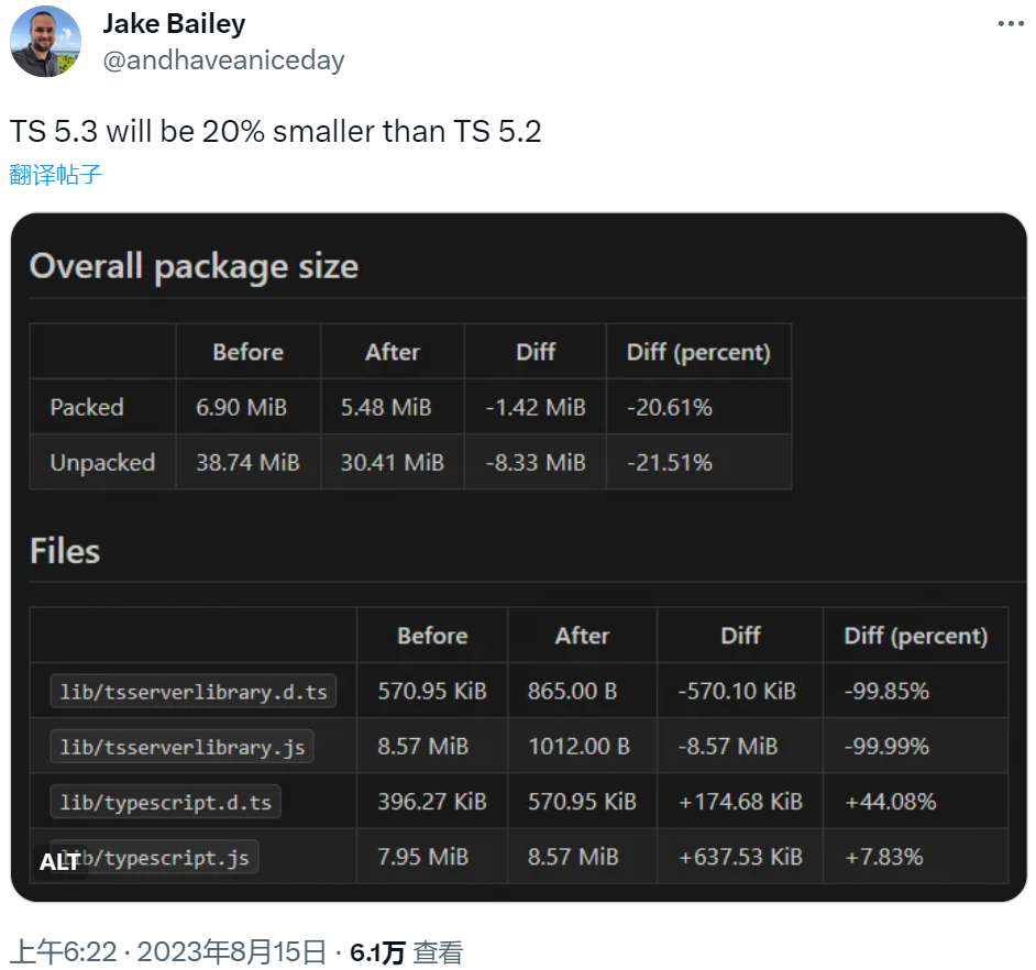微软高级软件工程师、TypeScript 工具链开发者 Jake Bailey 表示,TypeScript 5.3 的体积将会比 5.2 减小 20%。