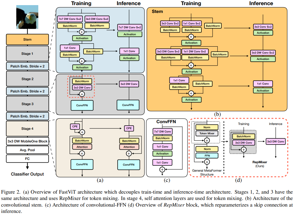 FastViT 有机地结合了 CNN 和 Transformer 的优势,无论在精度或者运行效率上均有了稳定的提升。FastViT 引入了一种新的 Token 混合算子,命名为 RepMixer。从名字来看,它结合了结构重新参数化技术。该算子的作用原理是通过消除网络中的 skip connection 来降低内存访问成本。