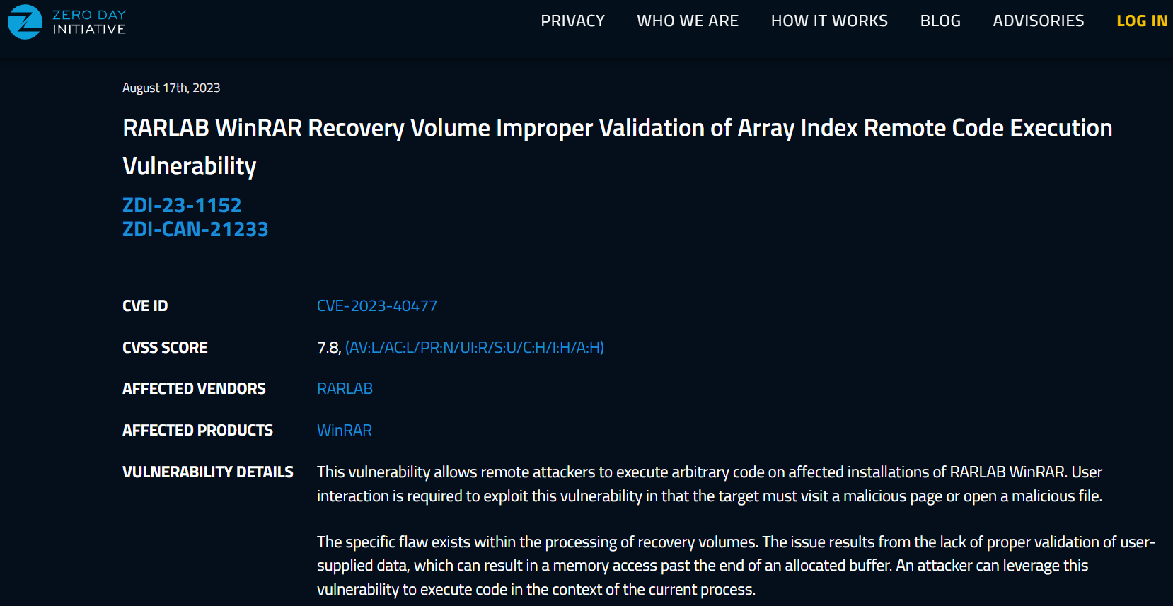 8 月 17 日,Zero Day Initiative 网站上披露了一项针对 WinRAR 的 0day 漏洞 (CVE-2023-40477)。该漏洞允许远程攻击者通过诱导受害者打开特制的恶意 RAR 压缩文件去执行任意代码。