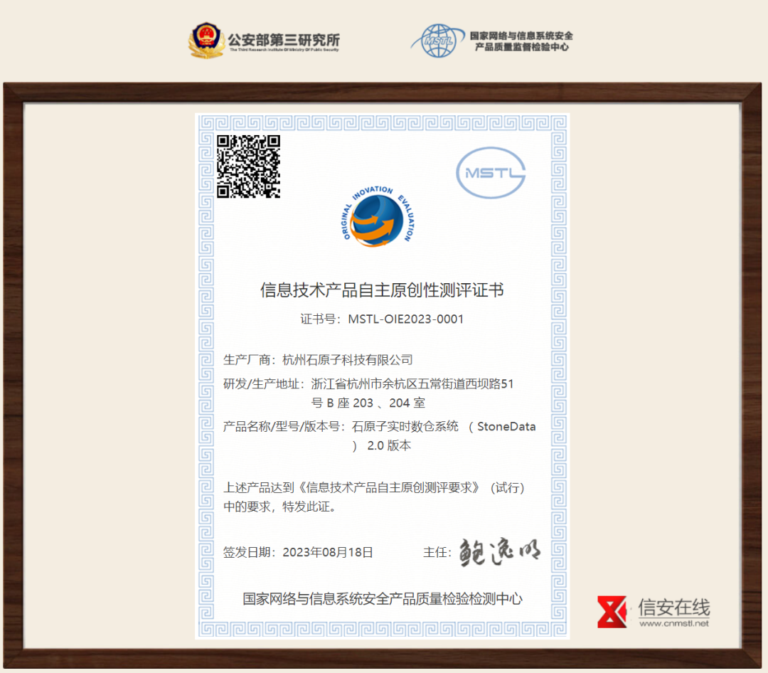 近日,杭州石原子科技有限公司(以下简称“石原子科技”)旗下自主研发的新一代离在线一体化实时数仓系统 StoneData 2.0 版本正式通过了公安部第三研究所(国家网络与信息系统安全产品质量检验检测中心)的信息技术产品原创性测评,并取得检测通过证书。本次通过公安部第三研究所信息技术产品原创性测评,标志着石原子科技的自主可控实力再次受到了国家级权威认证!