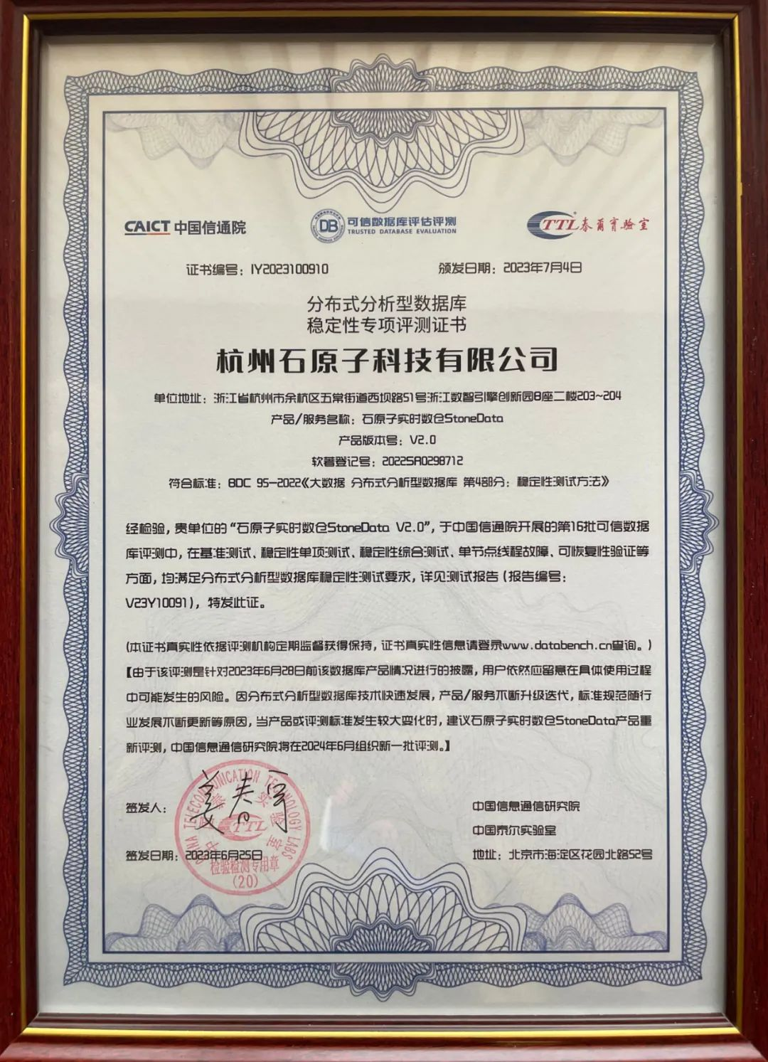 7 月 4 日,由中国信息通信研究院、中国通信标准化协会指导,中国通信标准化协会大数据技术标准推进委员会(CCSA TC601)、InfoQ 极客传媒联合主办的 2023 可信数据库发展大会在京隆重召开,中国信通院云计算与大数据研究所大数据与区块链部主任姜春宇在主论坛现场颁发评测通过证书,石原子科技相关代表受邀出席领取。