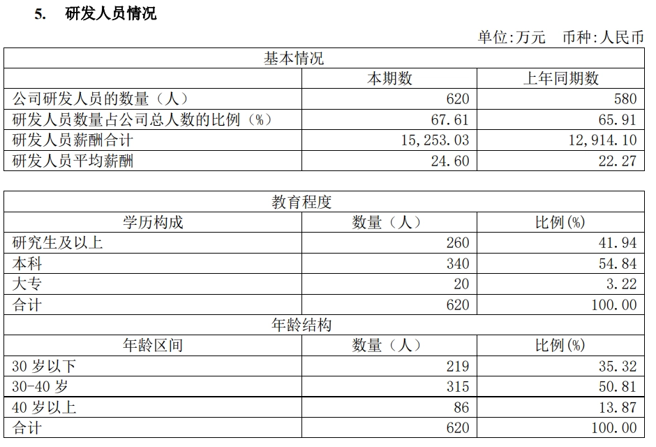 研发人员共 620 人,上半年平均薪酬为 24.6 万元,平均月薪超 4 万元。
