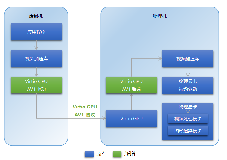 其中,Virtio GPU AV1 驱动主要负责接收来自虚拟机应用程序和视频加速库的视频解码请求,并将其封装成Virtio GPU AV1协议报文,通过virtio队列发送给Virtio GPU设备。Virtio GPU设备接收、解析报文后,继续将请求转发给AV1后端。AV1后端则调用物理机侧的视频加速库,借助物理显卡进行硬件解码,并最终将解码后的图像原路传回。