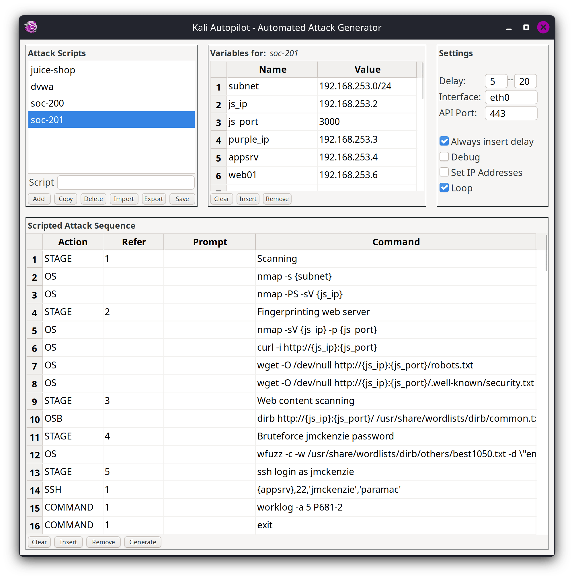 Kali Autopilot 包含一个 GUI 工具,用于设计攻击并生成执行这些攻击序列的攻击脚本(手动或作为服务),以及用于远程控制的 Web API 界面。