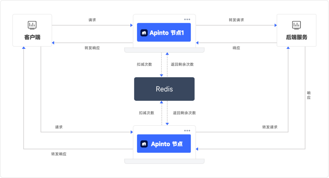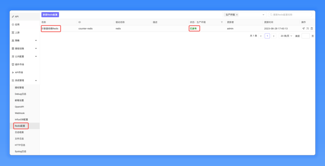 次数扣减架构图如上,该插件依赖 Redis 集群进行次数扣减同步,在配置该插件前,需要部署好 Redis 集群并在 Apinto 控制台配置并发布 Redis 配置,如下图: