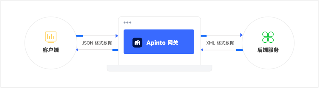 当客户端请求体为JSON时,经过 Apinto 网关后,将会将数据转换成XML发送给后端服务;接收到后端服务返回的XML后,Apinto 将会把该内容转成JSON返回给客户端,如下图所示: