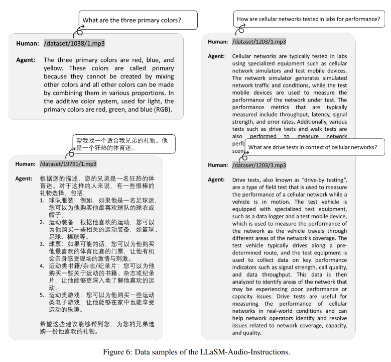 与此同时,研究人员还发布了一个大规模的中英文语音-文本跨模态指令遵循数据集 LLaSM-Audio-Instruction;通过从 GPT4-LLM、ShareGPT 和 WizardLM 中精心挑选对话,并使用文本到语音技术生成大量对话音频数据。
