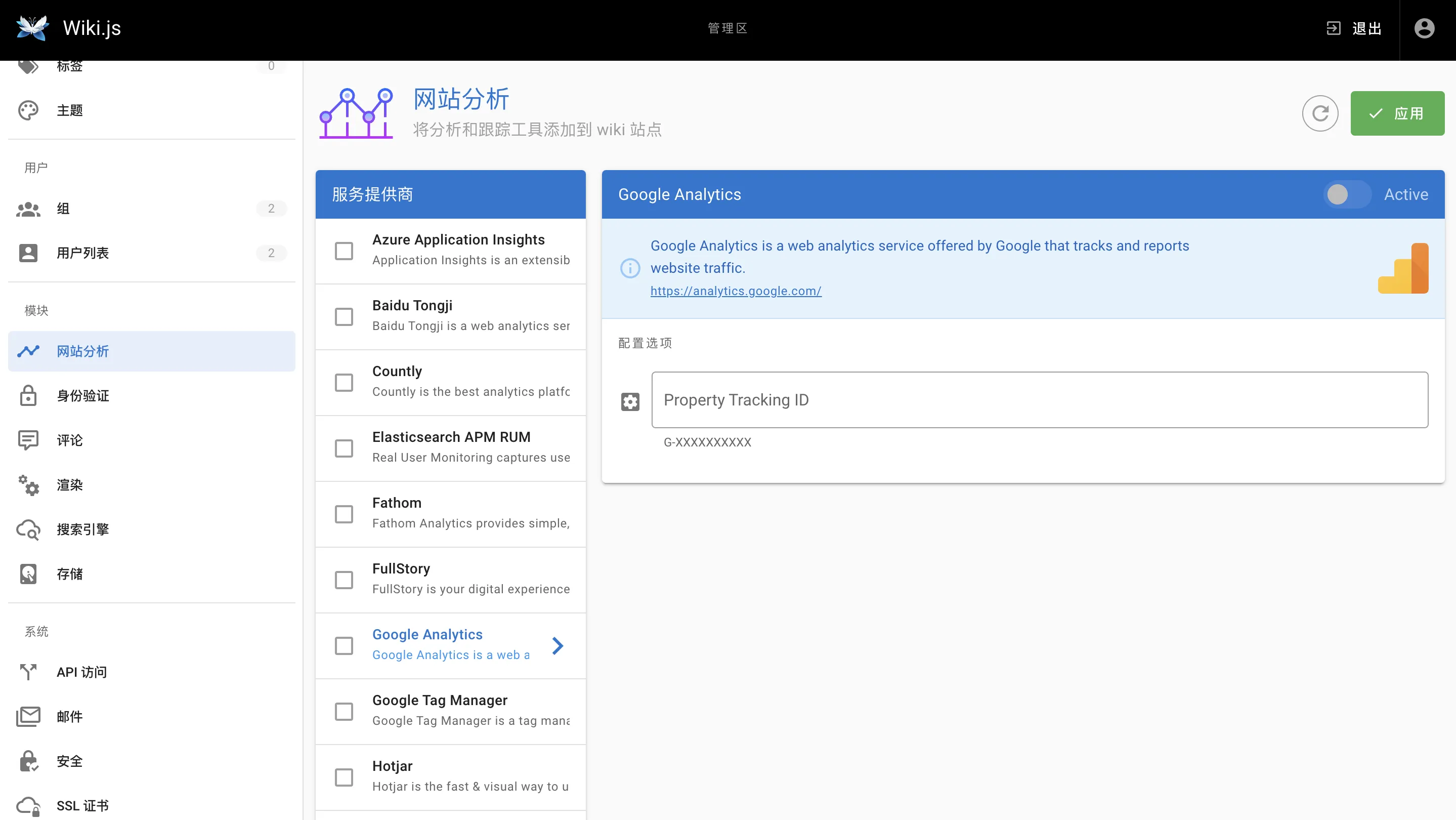 这仅是多达十几种网站分析工具中的一小部分。Wiki.js支持这些工具以满足用户的多样性需求,无论是需要基本的访问统计还是深入的用户行为分析,都能在Wiki.js平台上找到适合的解决方案。Wiki.js的目标是为用户提供详尽的网站数据,以便更好地了解和优化在线业务。