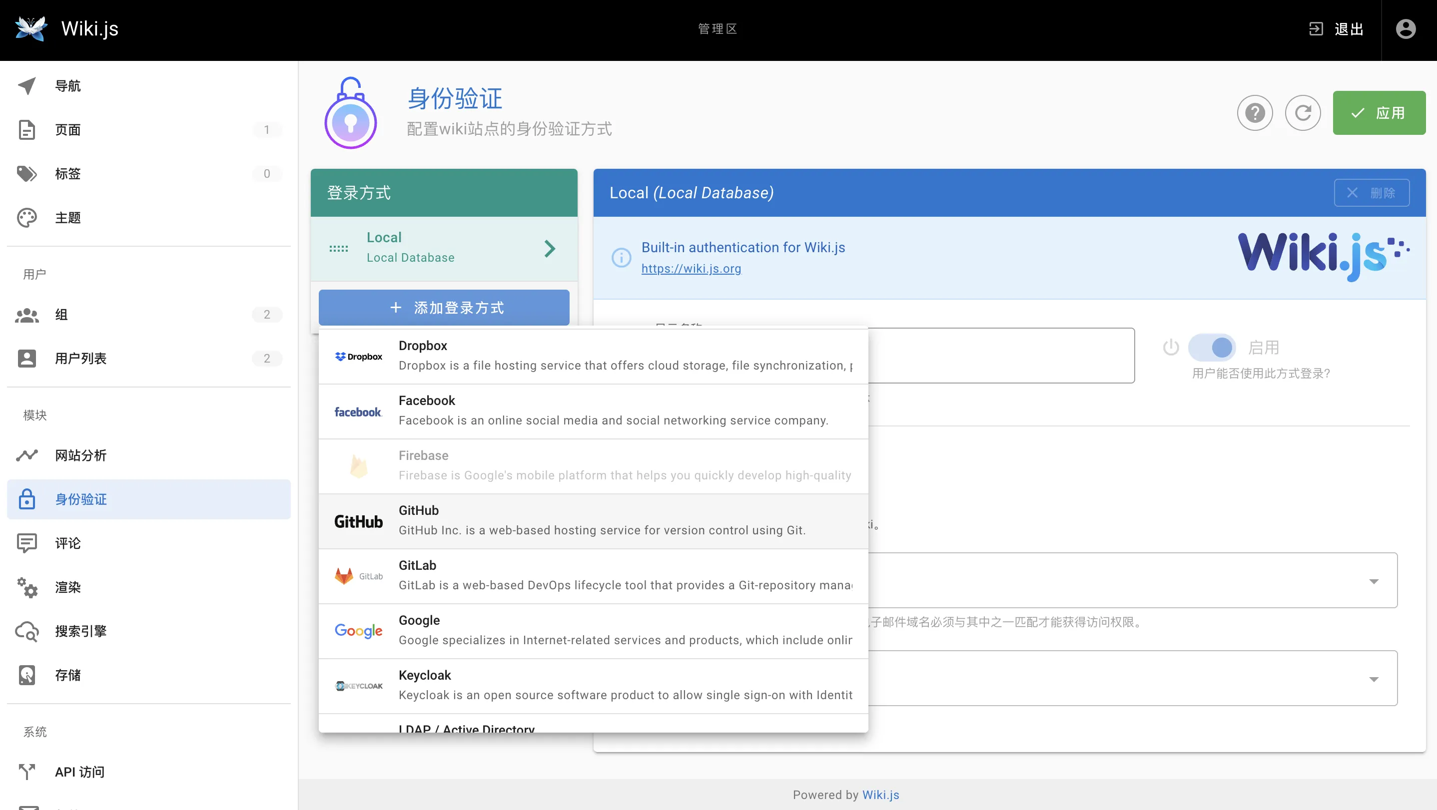 Wiki.js 是一款基于Node.js的开源、现代、轻量级和强大wiki应用程序。其界面简洁且美观、功能丰富且强大。适合做小团队的知识库,一方面方便管理和阅读,另一方面还能协同创作。