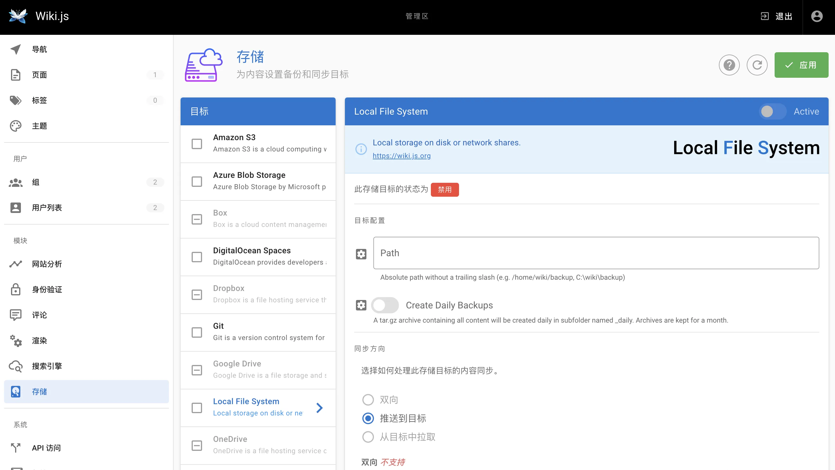 - 本地文件备份:如果用户更倾向于将备份存储在本地环境中,Wiki.js也支持本地文件备份选项,以满足特定的需求。