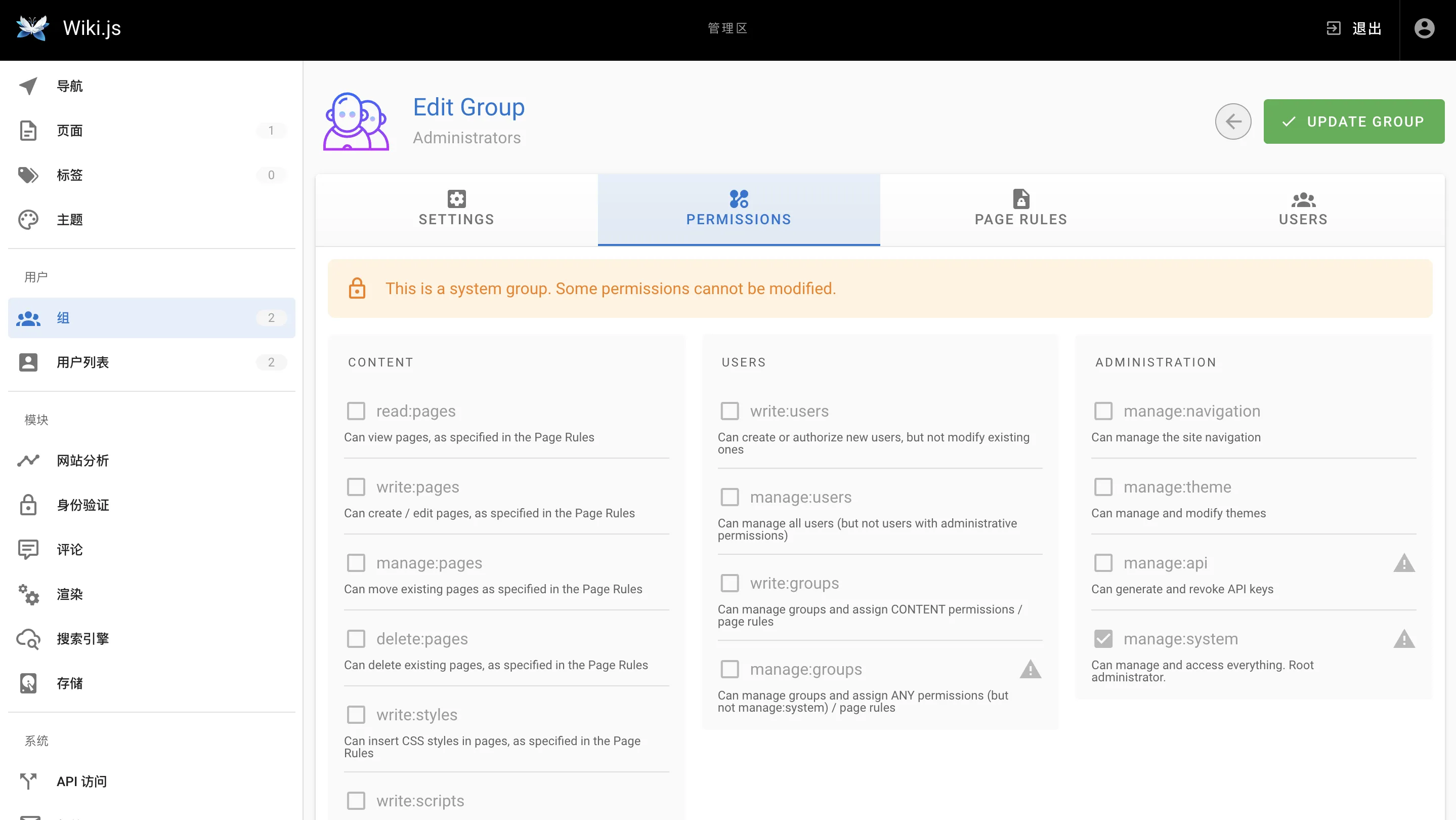 Wiki.js提供了高度灵活的权限管理系统,允许用户根据不同角色和特定需求,精确控制用户权限。这确保了系统在安全性和高效性方面运行良好。无论是限制访问特定功能、页面或数据,还是分配不同级别的管理权限,都可以根据用户的需求进行精细调整,以满足组织内不同角色的要求,同时确保敏感信息的保护和系统的合规性。