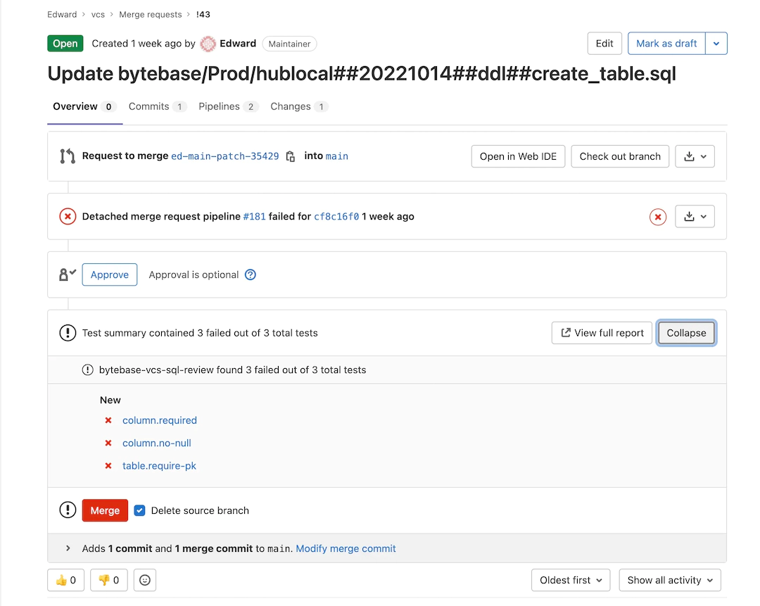 Bytebase 也已将 SQL 审核能力集成到 GitLab CI 流程中。用户可以配置 SQL 审核策略,之后可以在 GitLab 中管理 SQL 脚本并自助完成 SQL 审核工作,避免了在多个工具中切换,还可以通过前置 SQL 审核,在研发流水线的代码提交阶段就能发现问题,而无需等到部署阶段。