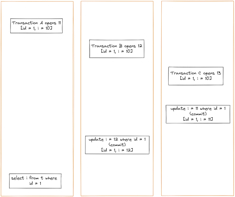 当事务 A 查询时,事务 B 和事务 C 属于未来事务,对事务 A 不可见。